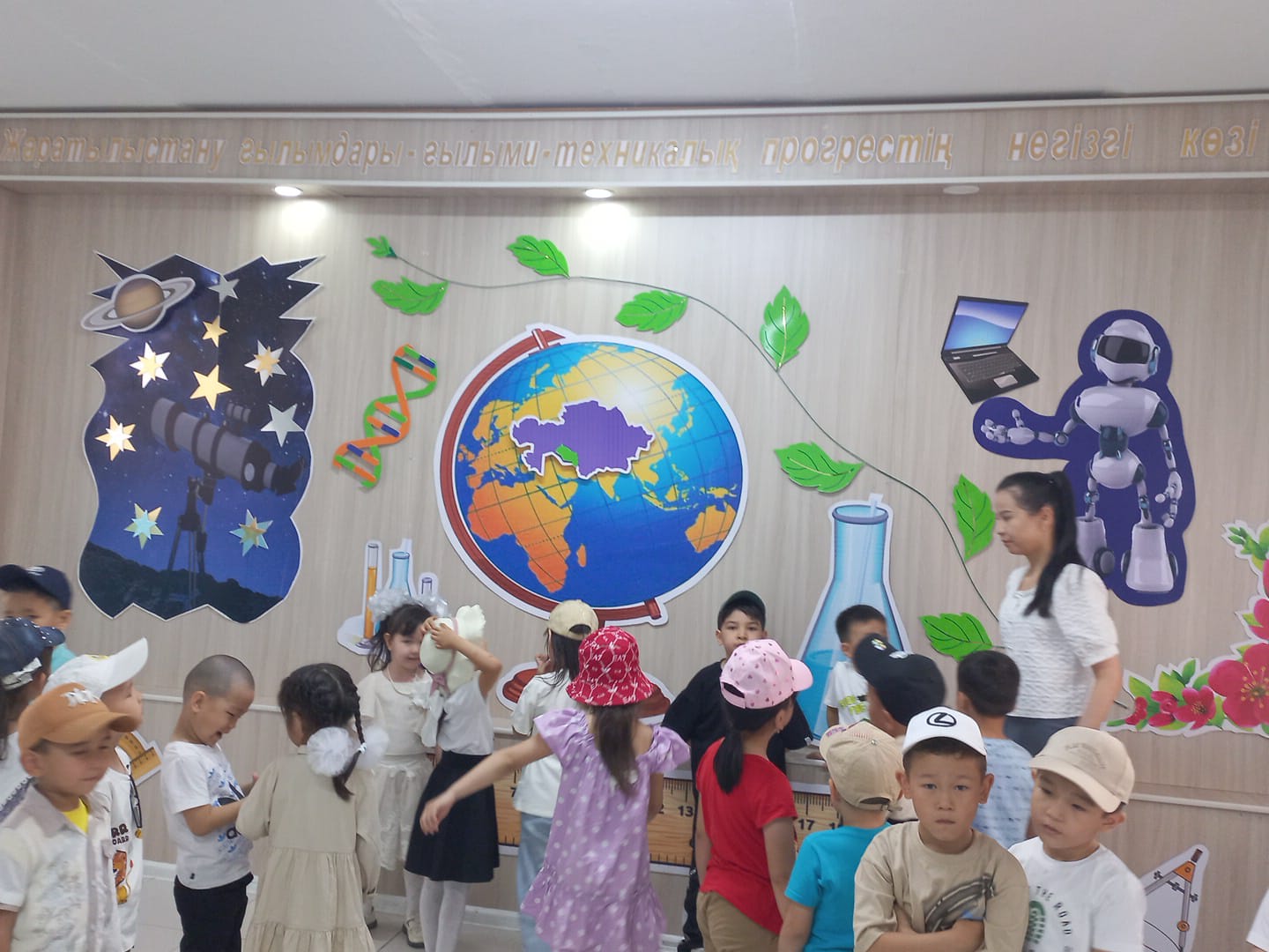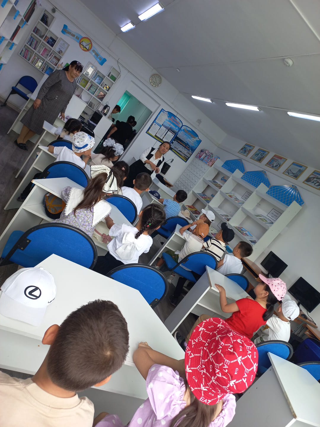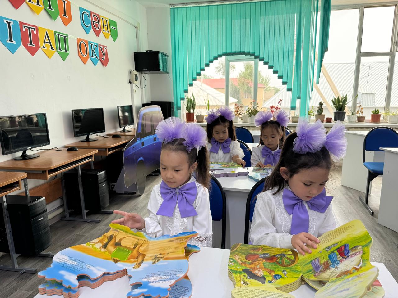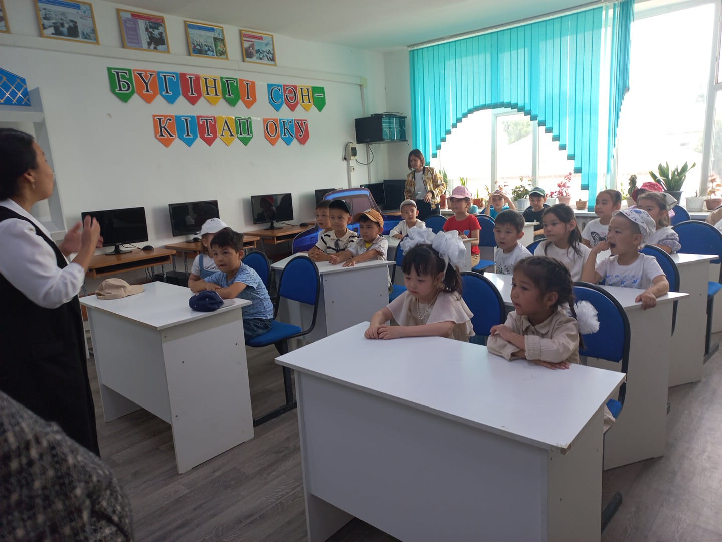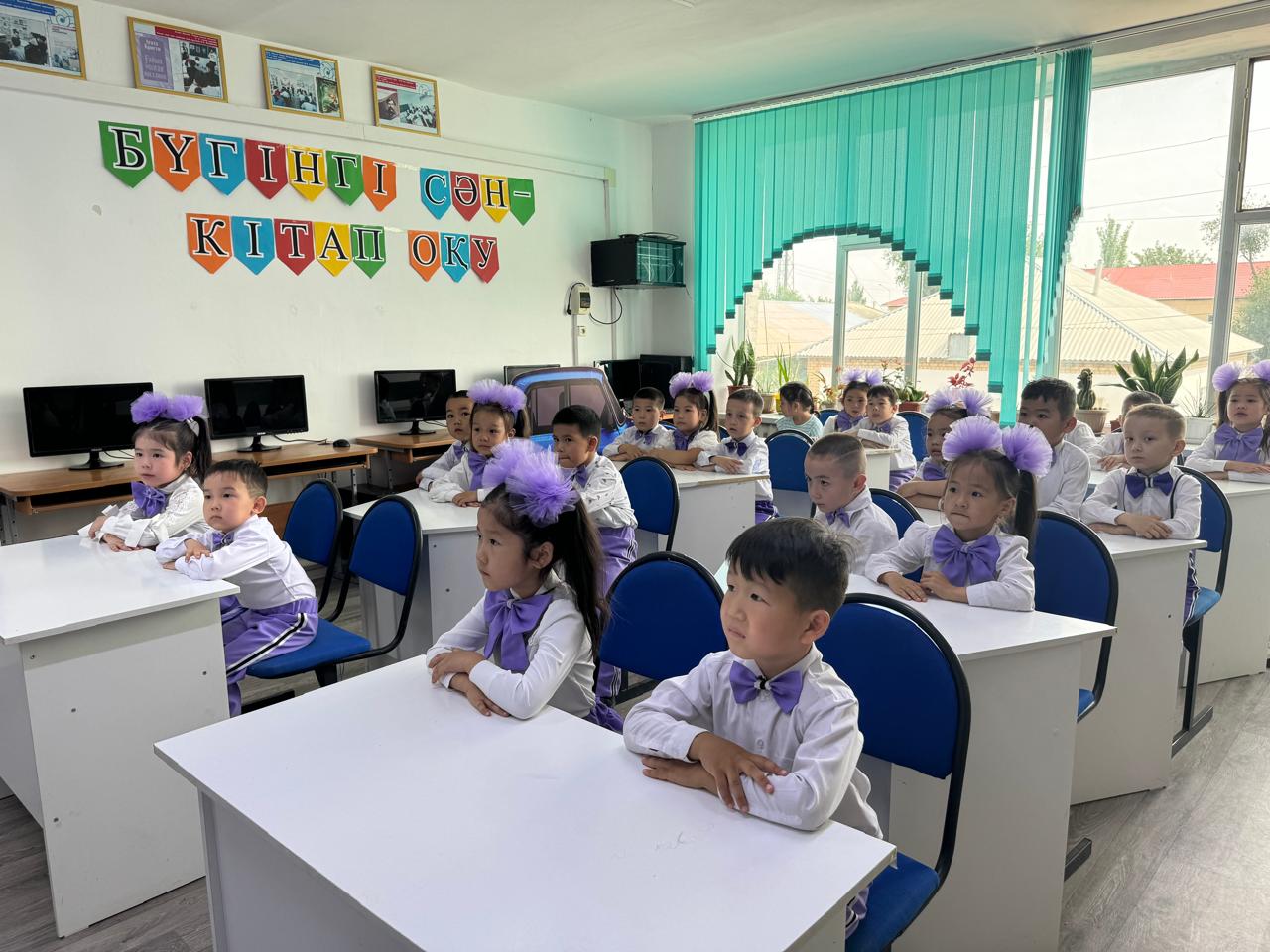Балаларға оқу сыныбы көрсетілді, онда олар нағыз мектеп оқушылары сияқты партада отыра алды.