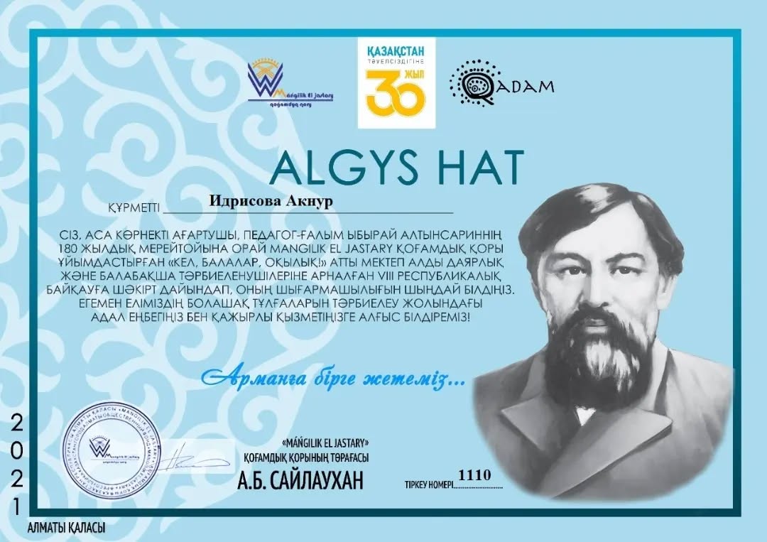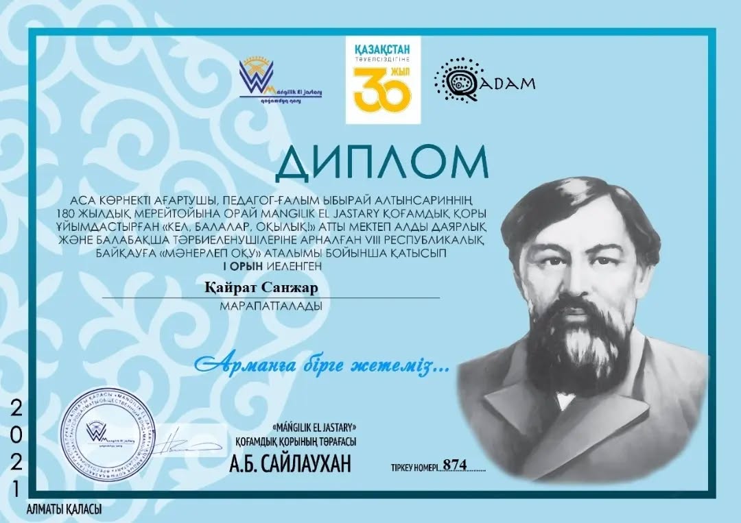 Аса көрнекті ағартушы Ыбырай Алтынсариннің 180 жылдық мерейтойына орай ұйымдастырылған Республикалық байқауда балабақшамыздың тәрбиеленушілері жулделі орындарға ие болды.