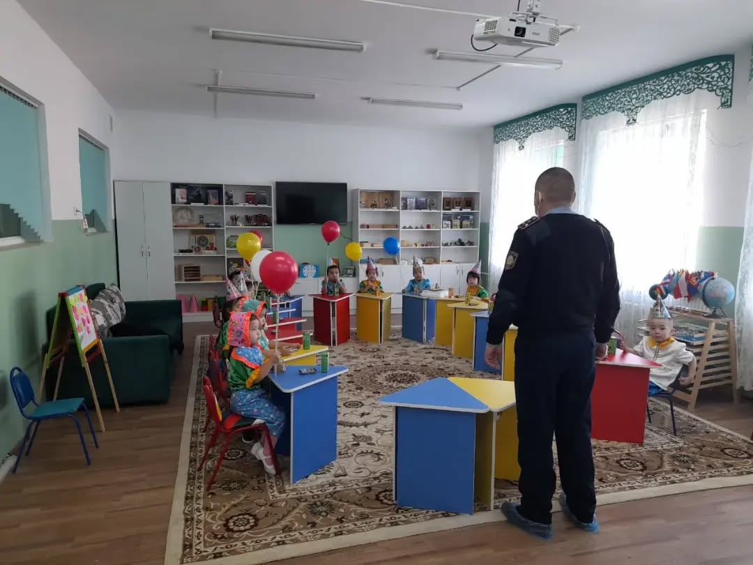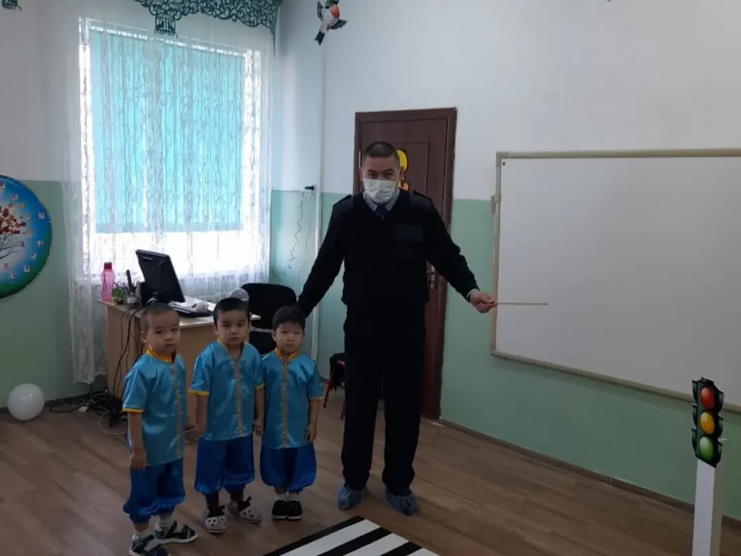 Қызылорда ҚПБ ЖПҚб ЮПб УПИ-ры полиция капитаны Қ.Жубаназаров, Ж.Асылбеков балапандарға жолда жүру ережесі мен бағдаршам туралы түсіндірме жасау барысы