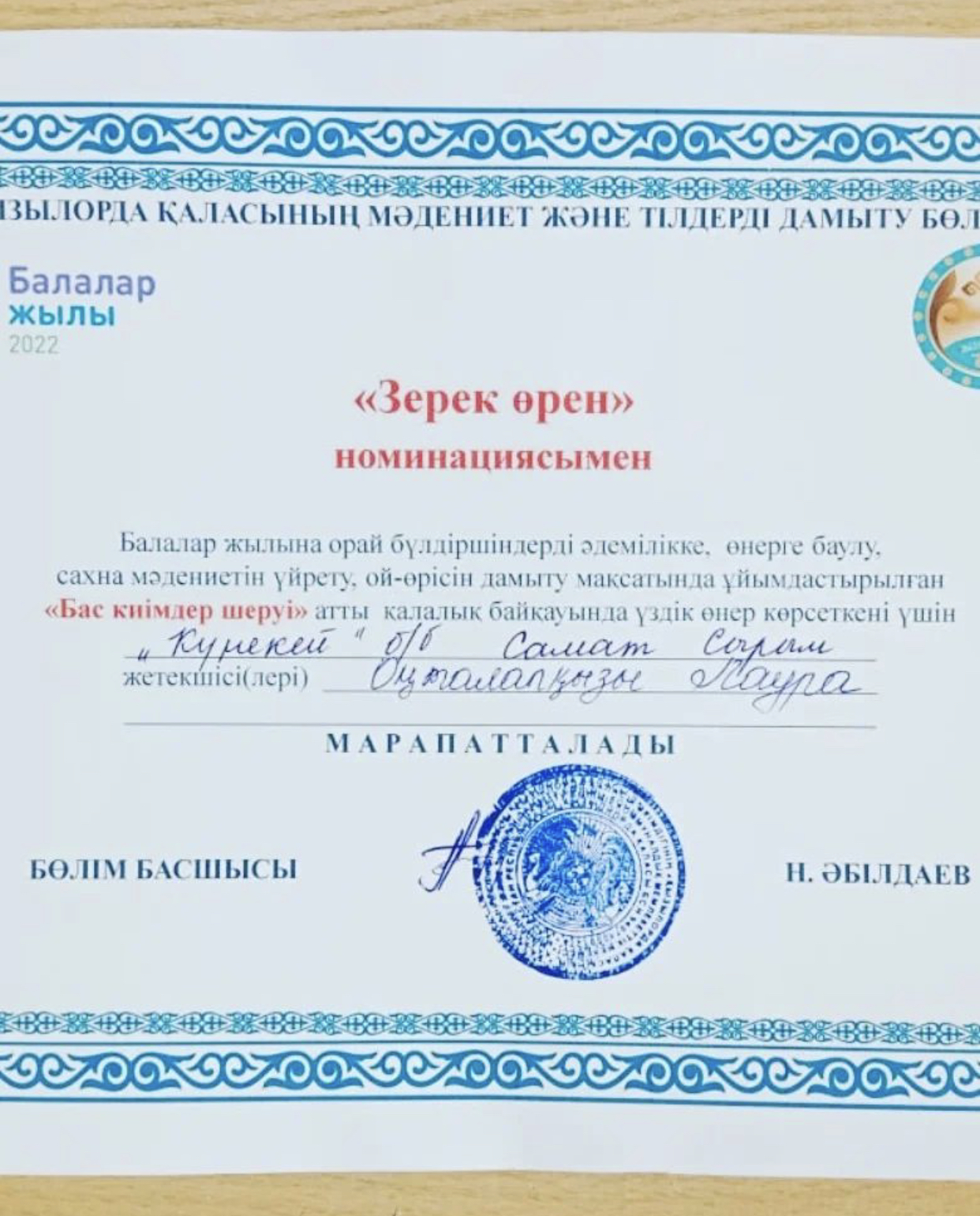 "Бас киімдер шеруі" атты қалалық байқауда балабақшамыздың бүлдіршіндері үздік өнер көрсеткені үшін "Зерек өрен" номинациясымен марапатталды.